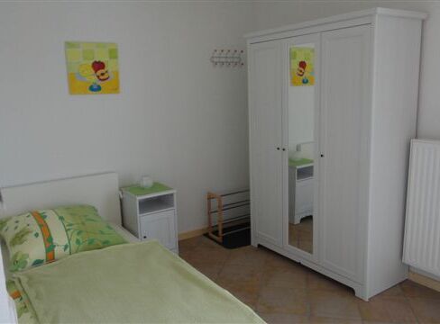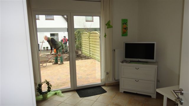 Das Zimmer hat eine Terrasse und Außenjalousien und ist mit weißen Möbeln, Handtüchern, Bettwäsche inkl. Küche komplett eingerichtet, inkl. Mikrowelle, Geschirr, Gläsern, Töpfen usw.